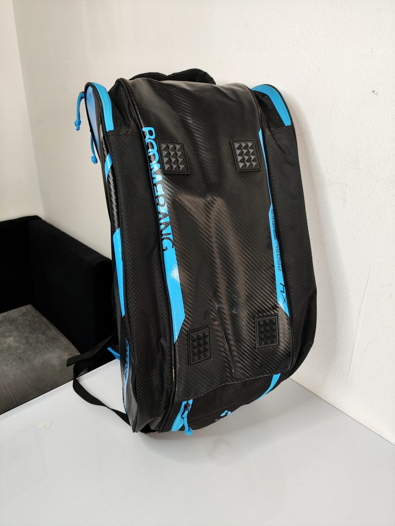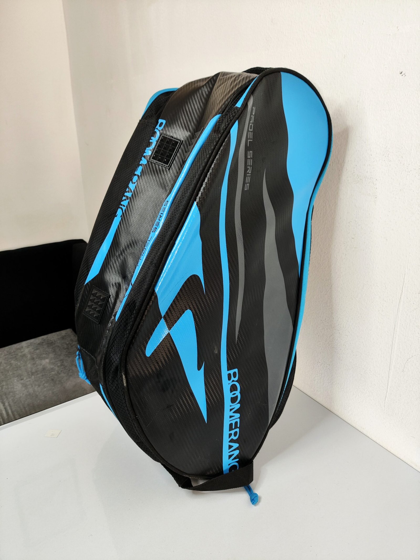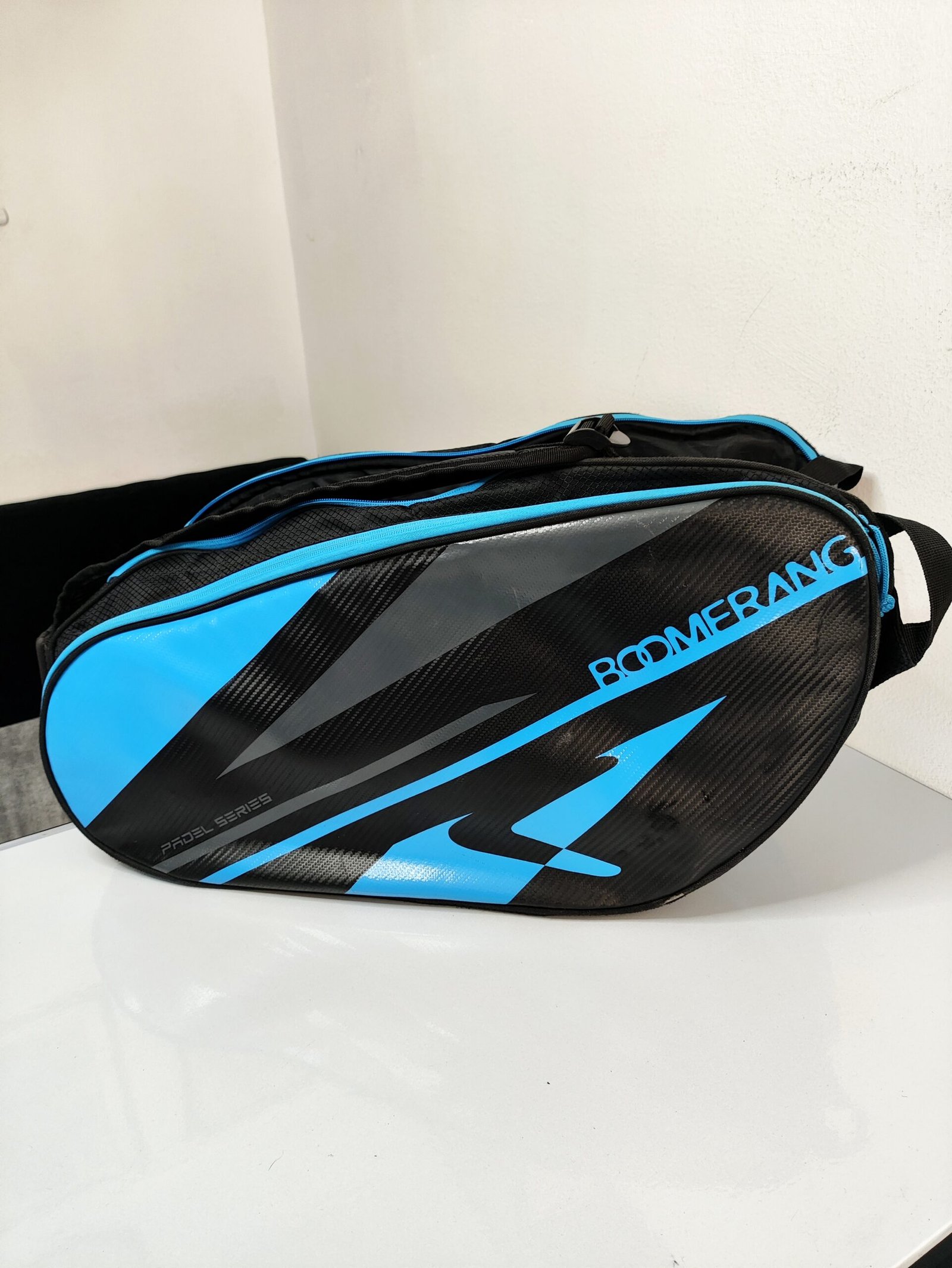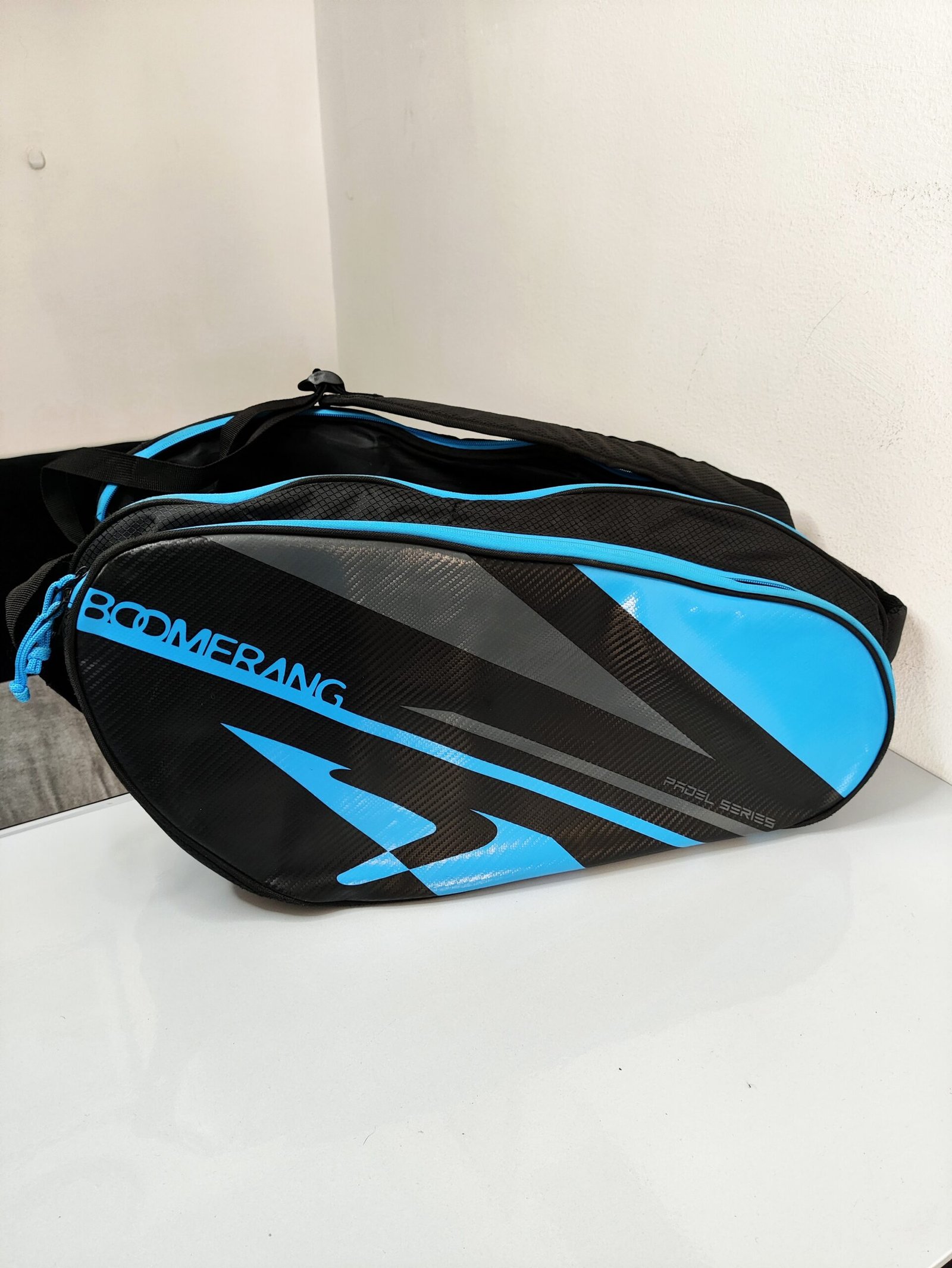 Le modèle présenté est le Paletero x4 Boomerang, reconnaissable à son design noir avec des motifs graphiques bleus et l’inscription « Padel Series ».